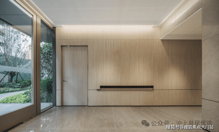 另外,项目还在卫生间台盆柜内侧设置了壁龛,放置抽纸、书籍等物品,增加实用性。入户玄关更是设计了大量的收纳空间。底部架空,可以用来摆放鞋子,并设置有嵌入式灯带,整体的氛围感拉满。并且为了方便业主后续在此处设置扫地机器人,底部架空区域还预留了插座。不得不说,浦发真的把所有生活中的细节,都考虑到了。