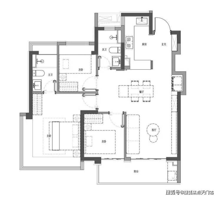 建面约100㎡三室两卫两厅,宽境从容