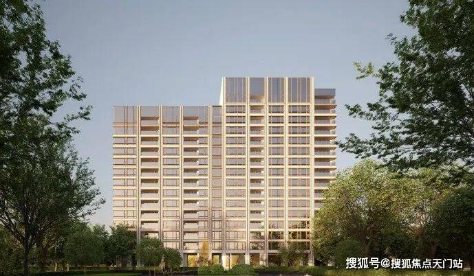 外立面采用沙漠风与白海棠石材,曲线纹理设计,点缀金属线条,大面积玻璃提高整体窗墙比。