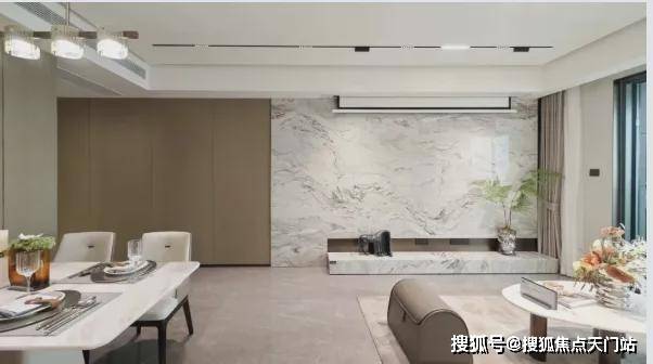 整体效果现代精致,十分符合当下年轻人的审美观;星级酒店式入户门,挑高约7米,宽约60米;石材金属线条背景墙加暖色系夜灯搭配,中庭花园水岛层叠、景墙错落,槭树青红间季节流转的温情脉脉展现,精致的水景让居住者仿若初入剧宴,感受剧目的艺术呈现……