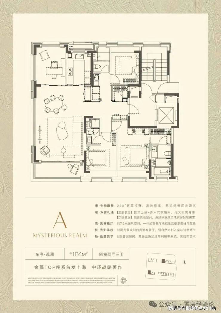 【约184㎡样板间】四房两厅三卫格局,LDKB一体化设计,客餐尺度达7.5米观景面,270°极致环幕窗景,最大化引景入室,百万方森态谧境成为私享级流动窗景。行政级主卧套房,打造步入式衣帽间、私享卫浴及南向超阔飘窗。在双套房的设计之上,公卫与北向次卧在空间布局上融入巧思,打造出了多一套间的生活体验。
