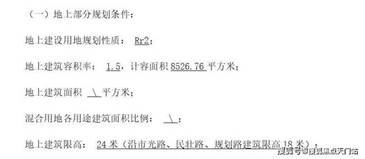 根据出让内容, 该地块建筑面积只有约8526.76㎡,容积率为1.5,地上建筑限高为24米,其中沿市光路、民壮路、规划路建筑限高18米。