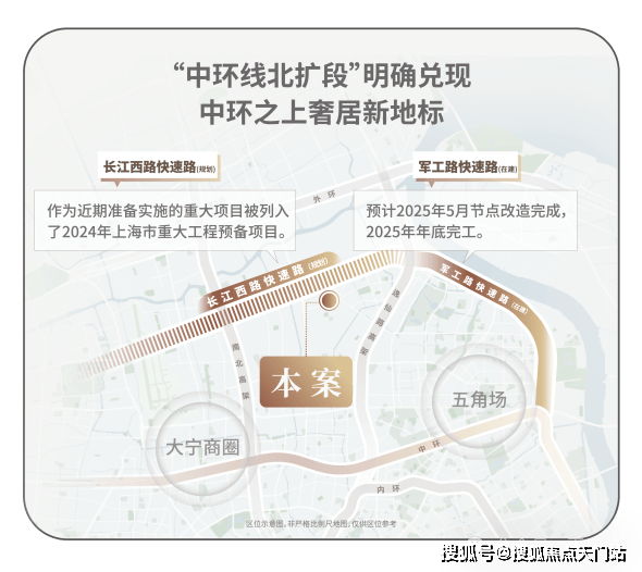 中环线北扩段明确兑现,军工路快速路25年开工,长江西路快速路列入上海市重大工程清单预备项目,快速链通城心, 随着中环线北扩段的政策明确,淞南将正式进入中环时间。未来经逸仙高架,进入南北高架、内环高架、中环高架,可快速链通南北上海;多维立体路网全面升级,未来区域价值再攀新高。