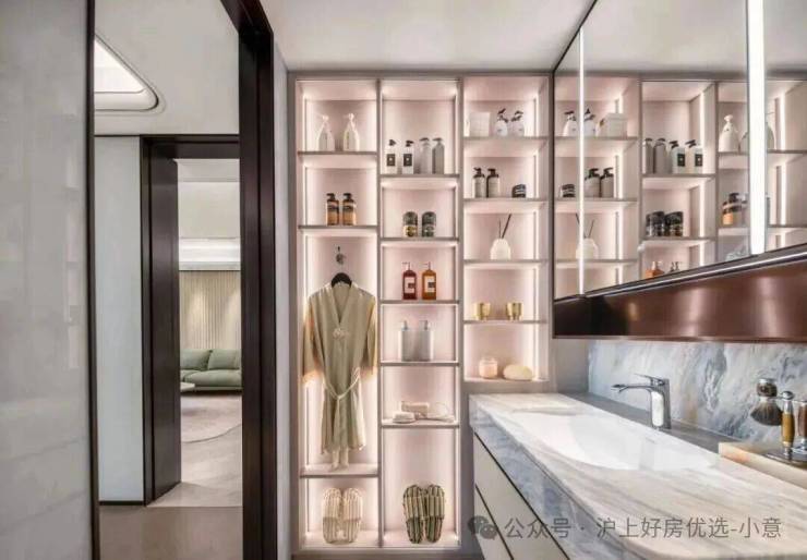 主卫镜柜收纳空间,满满的一面墙,还贴心配置了一个可调节温度的美妆冰箱,女主人看到了很难不心动!