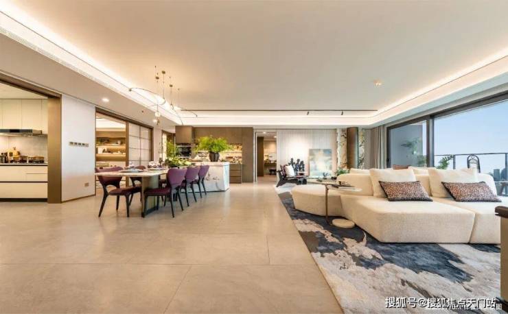 联通阳台、客厅、餐厅、厨房四大空间, 打造约7米×约9.5米将近约70㎡的宽厅, 无论是瑜伽、品茗、亦或是亲朋相聚……美好生活的场景,于此无尽上演。