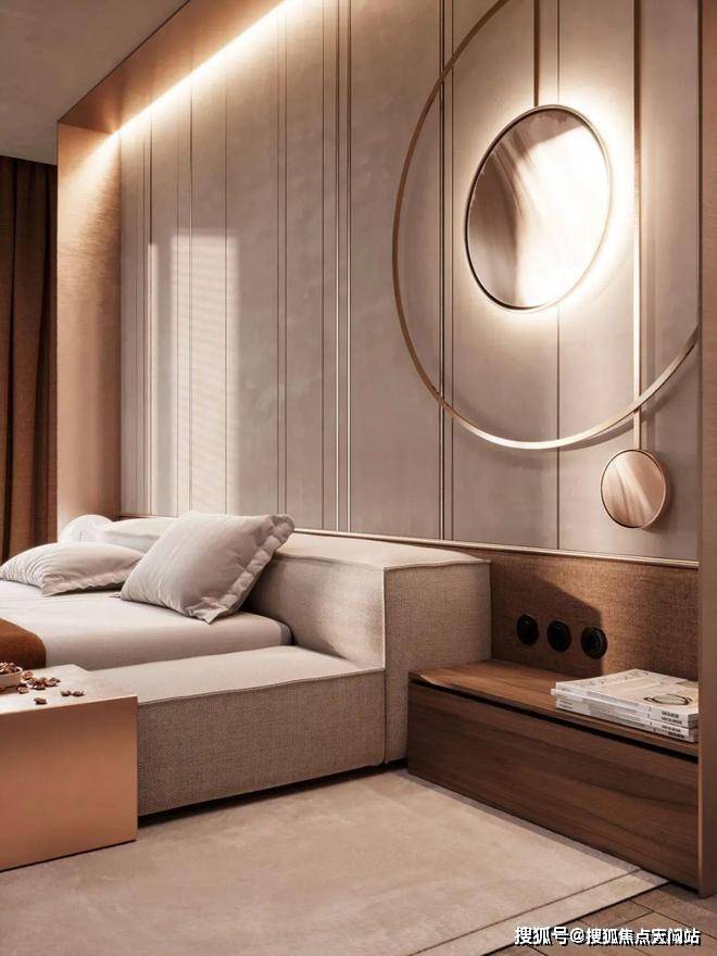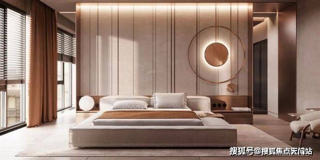 主卧室大气、质感,用简单的造型背景墙和圆形灯就渲染出了卧室的调性,仅用灰色和棕色便提升了空间的精致感。设计师钟爱用线条来映衬出空间的动静感。售楼处电话:400-118-3159