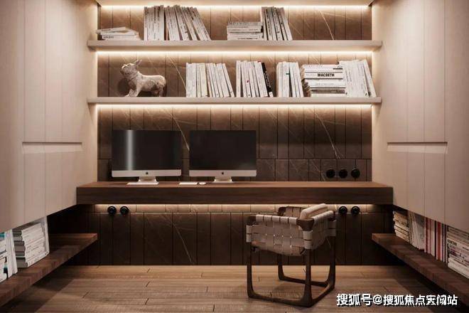 书房的隔间具有相当隐秘性和半开放性,黑色半透双开门很好的隔离了书房、更衣间和主区域,书房的面积不大,却干净、温暖,在辅助灯源的装饰下,营造了更多的居家惬意气息。