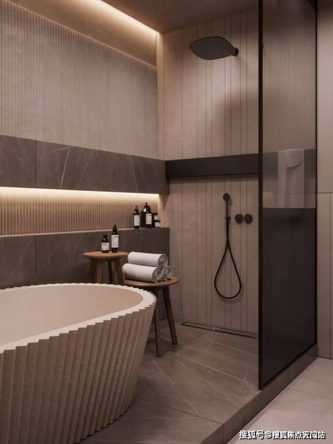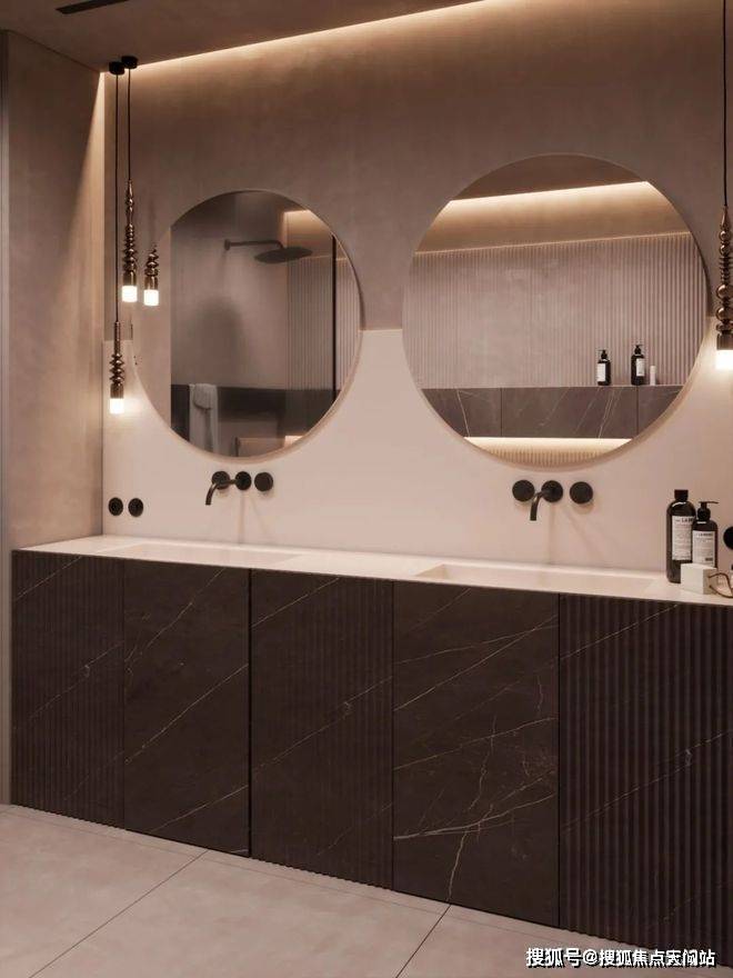 卫生间宽敞而明亮,摈弃过多的射灯或主灯,而是沿用部分照明灯具,立面的装饰线条参差不齐却独有韵味,深色大理石柜体压低了空间的调性,让空间的层次轻重分明。售楼处电话:400-118-3159