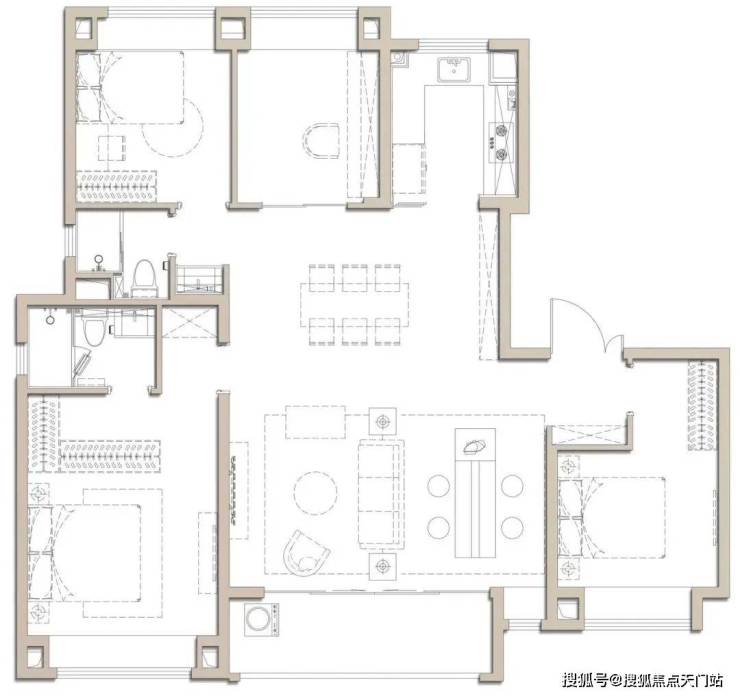 建面约100㎡是个典型的飞机户型,全明户型南北通透,独立玄关实用美观,几乎无过道浪费,延伸了空间的尺度。