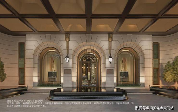 社区主入口复刻华尔道夫酒店仪式,严谨的柱廊序列在米色石材上投下充满韵律的光影,穹顶与拱券,瞬间将归家情绪升华至艺术层面。