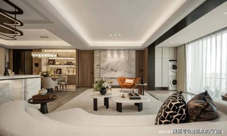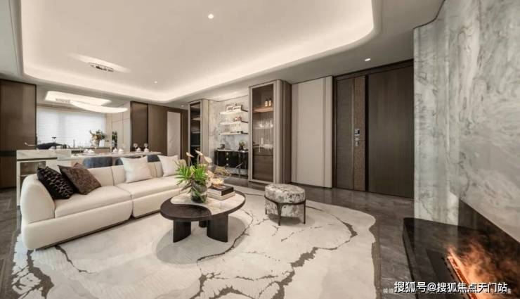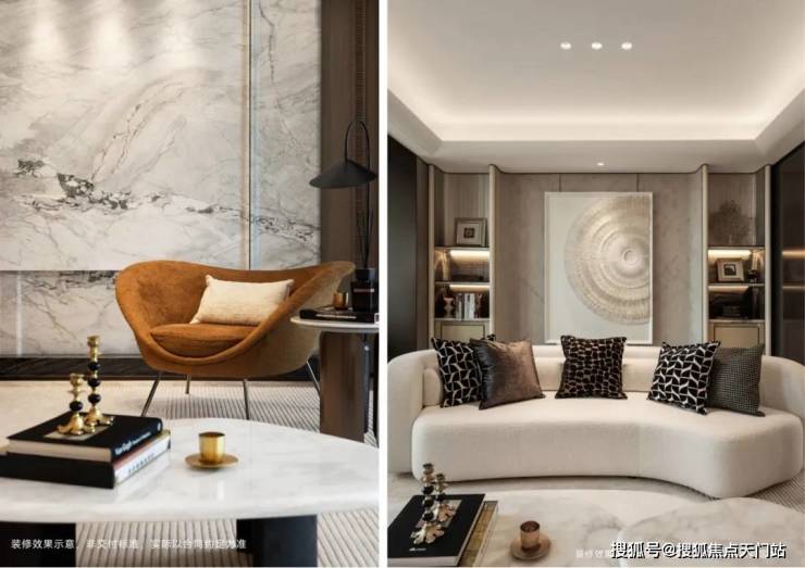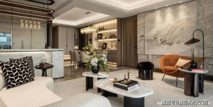 客厅背景墙的“烟雨江南”天然大理石,不同于传统平面背景墙,通过弧度及立体的造型处理,并镶嵌不锈钢材质,对于金茂而言,比奢石昂贵的,是让奢石真正与空间气场融为一体。