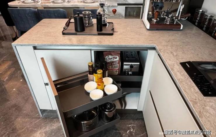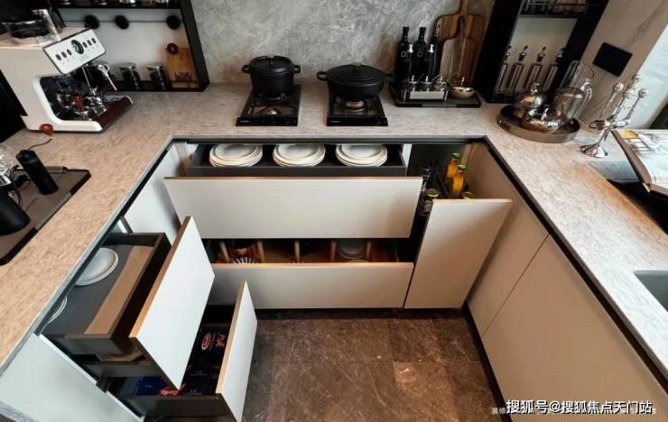 为使厨房成为「真正幸福之地」,璞元在各个细微之处倾注关怀,从地柜拉篮系统,到上柜系统,再到抽屉分格系统,浅抽与深抽搭配,让整个厨房空间,既百变,又充满秩序。
