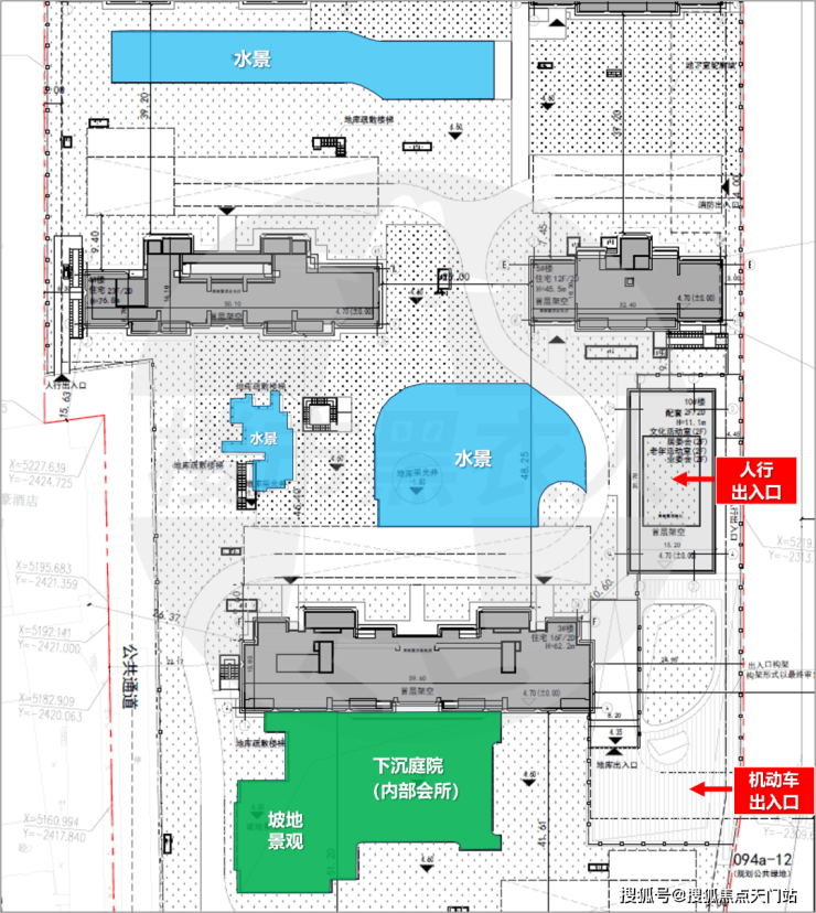 从规划图来看,社区内部广泛运用水景:共有2处大型集中水景+1处宅间水景,周边还有下沉庭院+坡地景观,大概率此处未来社区会所的位置。值得一提的是,项目的楼间距全部在35米以上,最大楼间距达到了约51.2米。