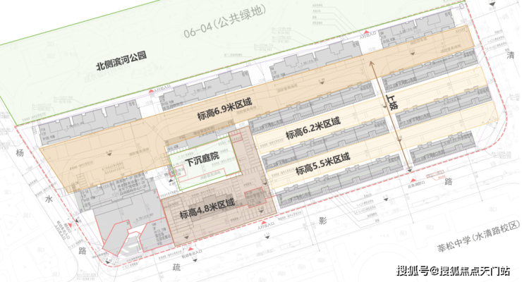 从公示的总图上来看,地块南侧场地标高在4.8米,北侧已经到了6.9米,有2.1米的高差。