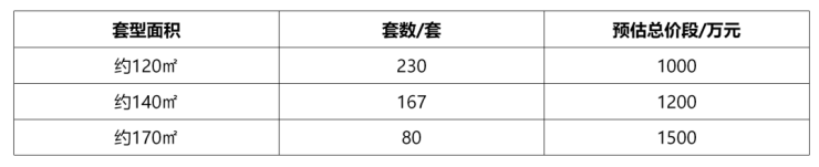 高层为约120㎡和约140㎡产品,四层叠拼分为上下叠,约170㎡产品。