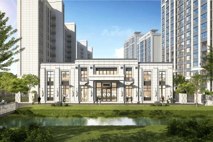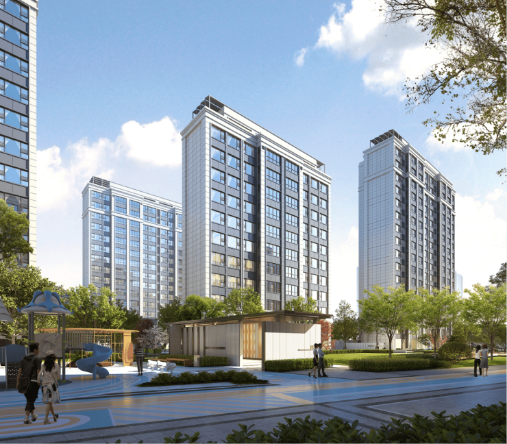 通过园林中曲径通幽的设计手法,布置景墙设计,引人入胜。社区内打造大树聚场、儿童乐园、阳光草坪、健身跑道等多个功能空间,依托架空层构建出更多的互动空间,扩展社区内的活力活动场域,为居者营造更多幸福生活的场景。