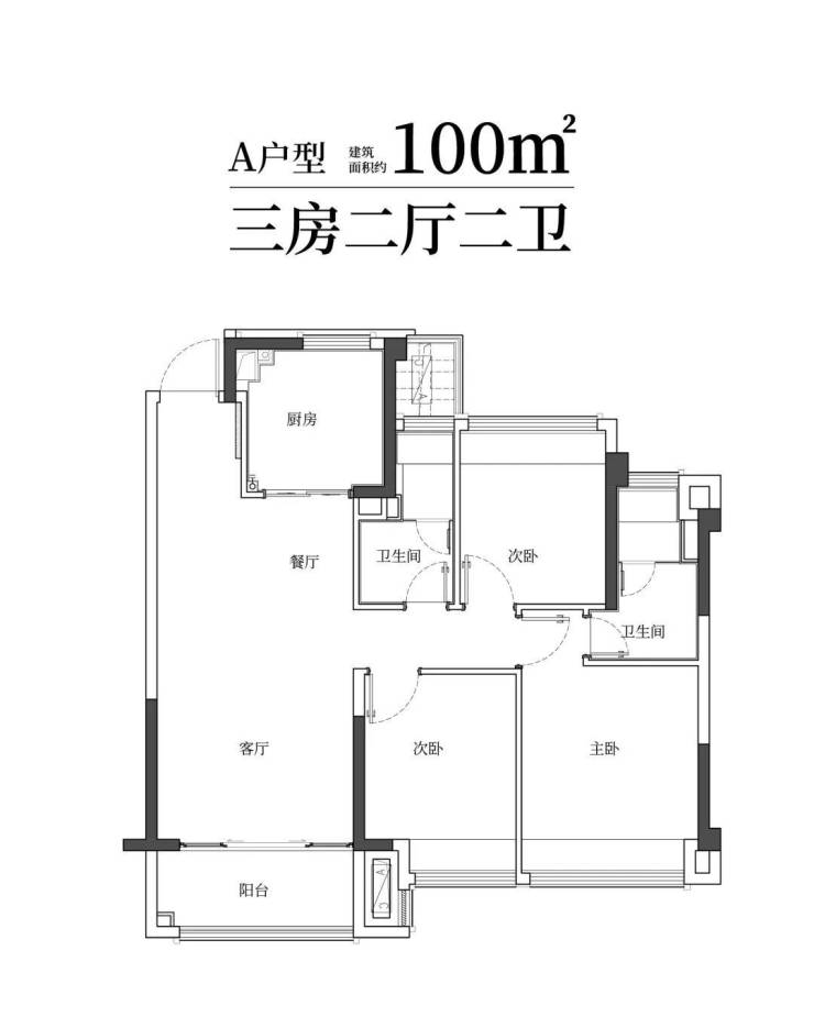 建筑面积约100㎡雅致三房两卫,满足二娃时代;