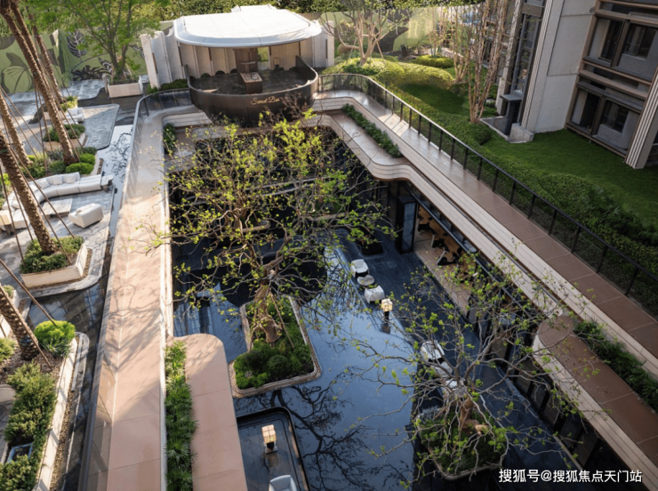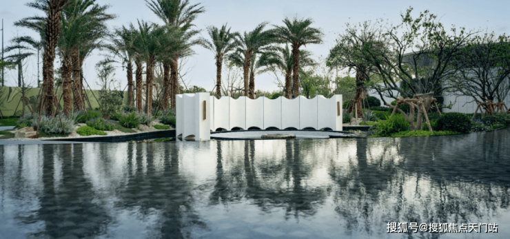 实景呈现的岛屿水院,作为保利天奕五座全球大师花园之一,在银海枣树阵、下沉式庭院、镜面池畔卡座的呼应中,成为未来居者沉浸自然的惬意之地。温柔闲适的落日廊吧,犹如身处海岛之畔,感受蓝调时刻的优雅情调。