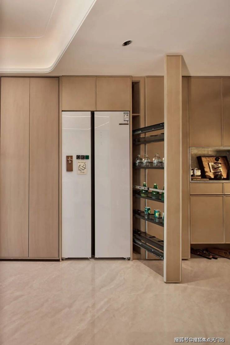 4.创新S墙分户设计,让收纳系统从平面延展为立体暗线,通过玄关柜、冰箱柜、零食拉篮的巧思,用立体空间创造更海量收纳!
