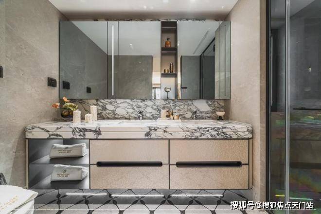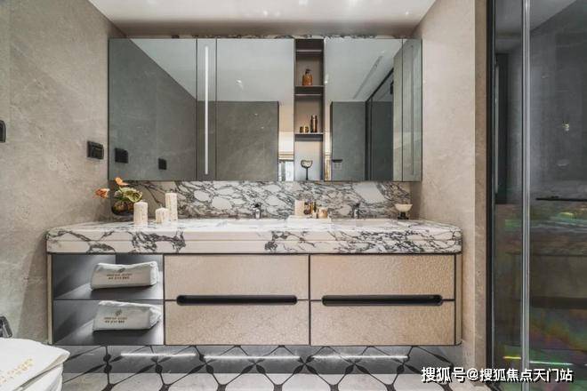 主卫采用意大利“大花白”天然石材实现地墙满铺,双台盆与双镜柜的对称设计复刻五星酒店规制,美妆冰箱精准控温呵护护肤品,搭配劳芬智能一体马桶、当代五金花洒,这样的王炸组合以往只会在200㎡+ 豪宅里出现。次卫延续品质标准,干湿分离设计加上高仪龙头和唯宝智能马桶盖,每处细节皆为高端居住量身打造。