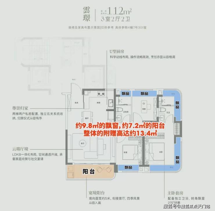 这个户型有约9.8㎡的飘窗,约7.2㎡的阳台,整体的附赠高达约13.4㎡。这是目前上海外环沿线,是附赠率最高的一个小高层产品。
