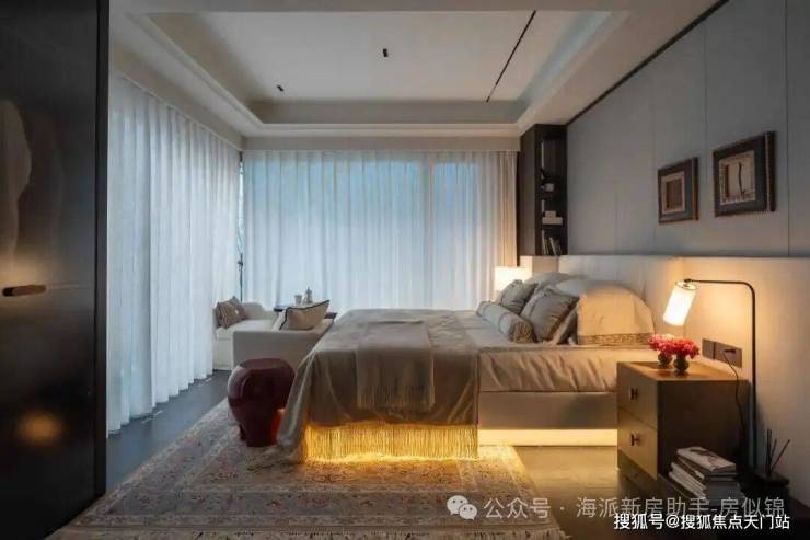 以整块奢岩破题,以皮革融入,白金沙岩板、140户型采用罗马白洞石岩板,主卧背景采用了车线工艺硬包,将豪宅标配升华为材质的史诗。