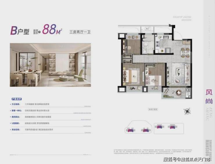 深嘉上府以88-99㎡的明星爆款小户型,圆年轻人的置业梦想。其中,88㎡户型以三房两厅一卫的格局,兼具功能性与尺度感。南向三开间,做到两间卧室朝南,这样的面宽,媲美市面上100㎡户型的新房尺度。u字形的厨房,动线合理。餐厅空间,能够从容摆放一张四人大餐桌。全屋飘窗设计,将赠送空间拉满。