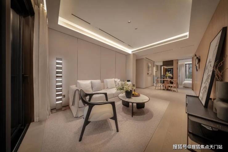 客厅无主灯、隐藏式的空调出风口、木饰面电视机背景墙、内嵌式的金属踢脚线,极简风审美呈现: