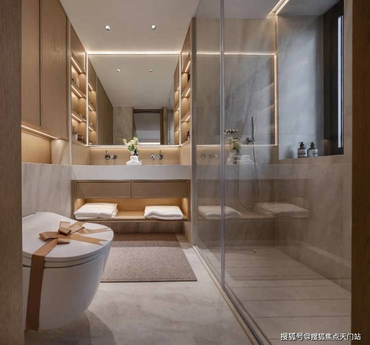 主卫采用TOTO(或同等品牌)挂壁式智能马桶,水龙头、花洒全部采用德国当代(或同等品牌),号称“卫浴届的劳斯莱斯”;