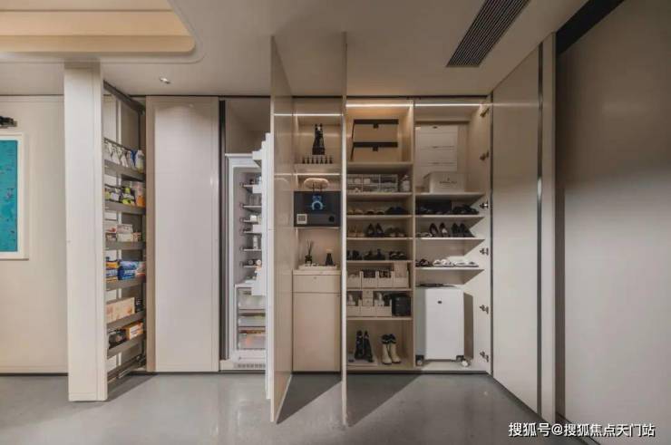 进门整面墙打造了玄关柜+“S”墙+零食柜设计,搭配烤漆板饰面,实用性与质感满分!