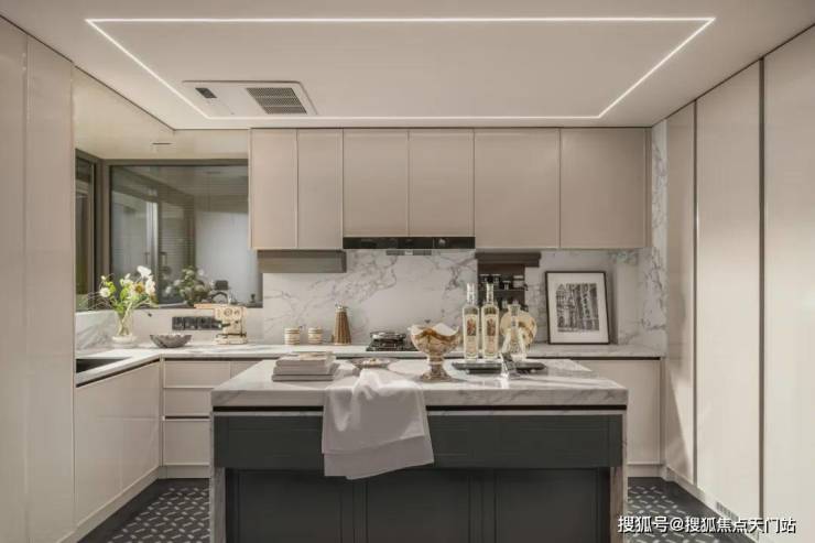 开放式厨房+岛台设计空间更通透!转角抽屉收纳、下拉栏顶部设计反光镜避免视觉死角、轨道插座置于岛台侧墙不占台面空间等等,众多收纳细节思量到位,匠心独运!