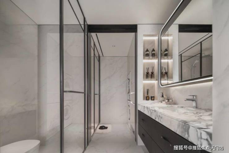 ✔卫生间地面和墙面整体性也非常强,奢石台面的纹路和岩板墙面和协调。