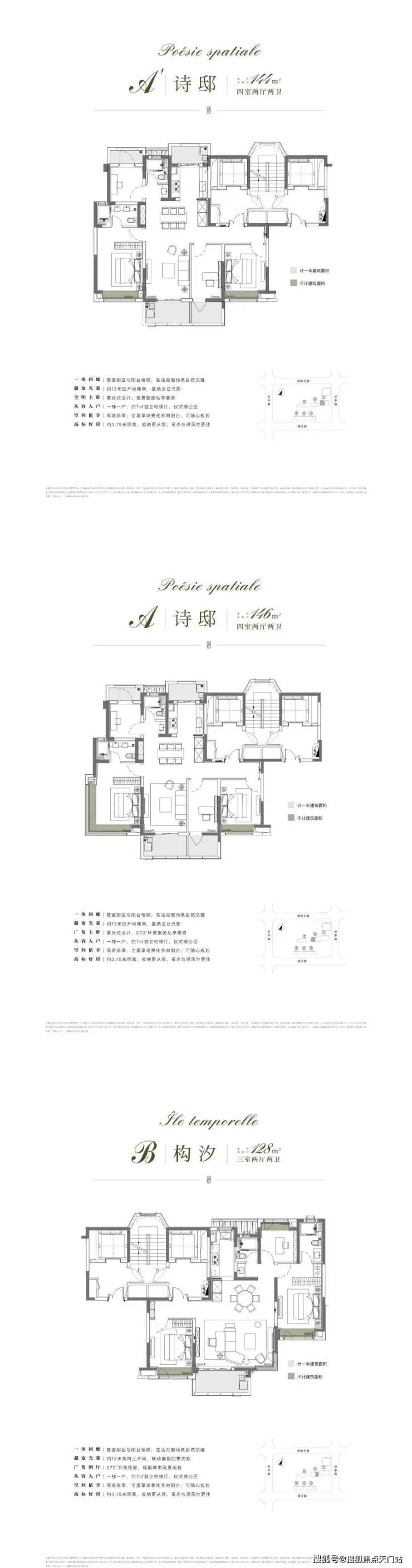 项目以116㎡户型为起步,纯粹改善型社区,所有户型都做到了约3.15米的层高,比普通住宅的层高更是多了35厘米左右,一梯一户的专属配置,预留的约7㎡独立入户区。建面约144㎡和146㎡的4房甚至做了4个阳台。
