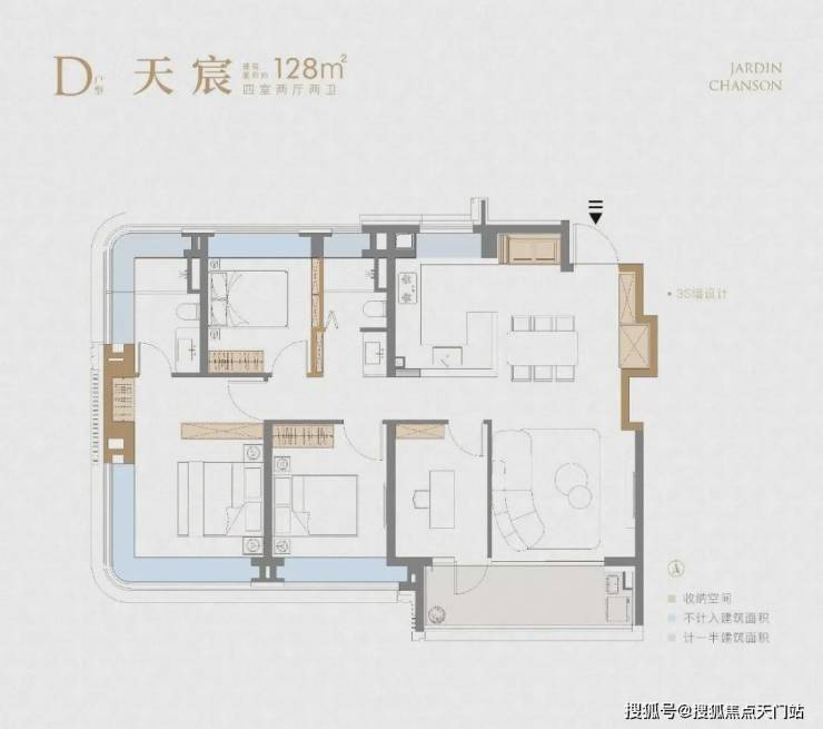 项目建面约128㎡4房户型延续了前作3S墙的设计,保证了收纳空间的丰富性。