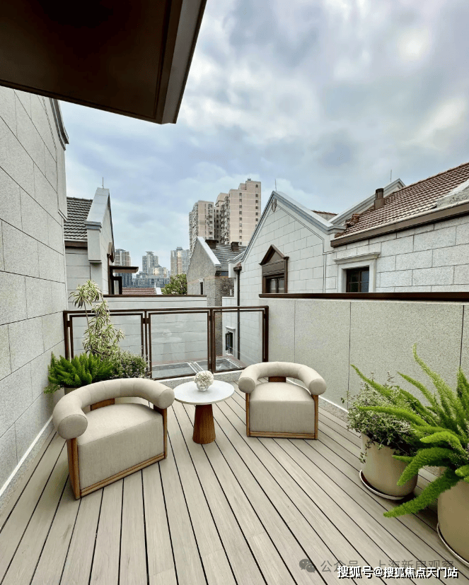 从庭园看向别墅, 保留的老山墙、砖楣和门头,再加上悬挑阳台和层层露台 ,这种传统风貌带给人一种重见历史的感慨,又有温馨、宁静的现代舒适感。