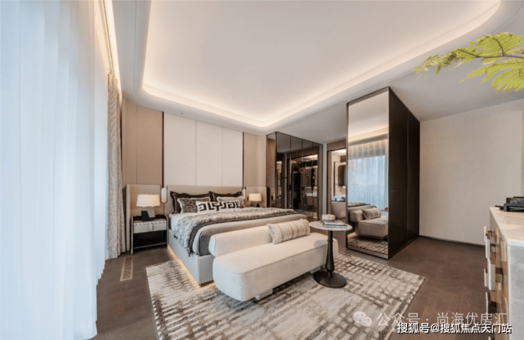 主卧套房以黄金比例精筑约35㎡「环形生活舱」,整合睡眠区、独立衣帽间、星光浴缸及观景露台,通透玻璃幕墙引晨曦星辉入室,让自然成日常背景乐,真正诠释「生活即高定」的奢居理念。