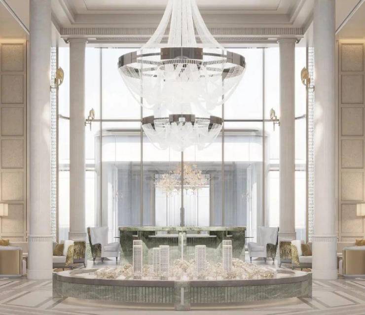 基座更是采用 大面积石材搭配 艺术玻璃及 古铜色金属窗框,辅以奢石、艺术等点缀,从上到下,处处皆是奢华质感。