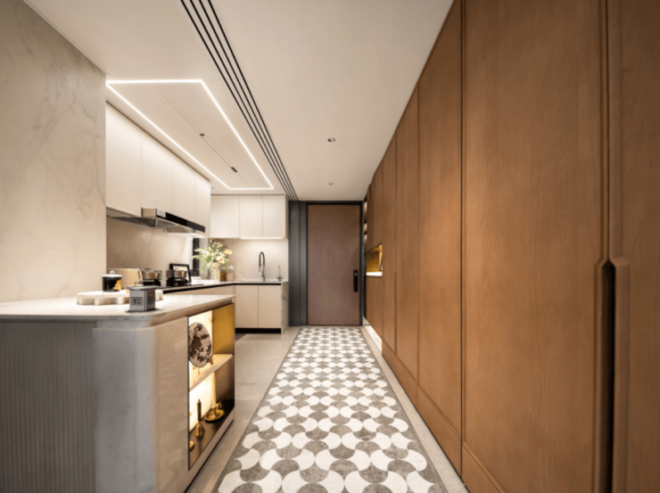 厨房方面, 水波纹玻璃+金属造型玻璃移门,隐形上轨,厨房交付 线性凉霸、末端饮水、博世或AEG(或同等品牌) 烟灶、洗碗机三件套。