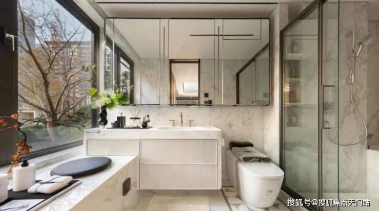 主卫的镜柜,也做双面收纳设计。主卫延伸出来的创新飘窗,可以在上面摆放各种日常用品。