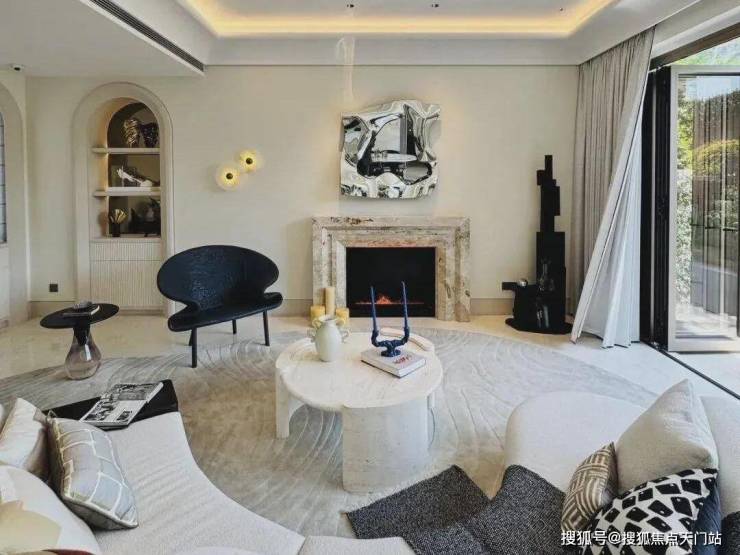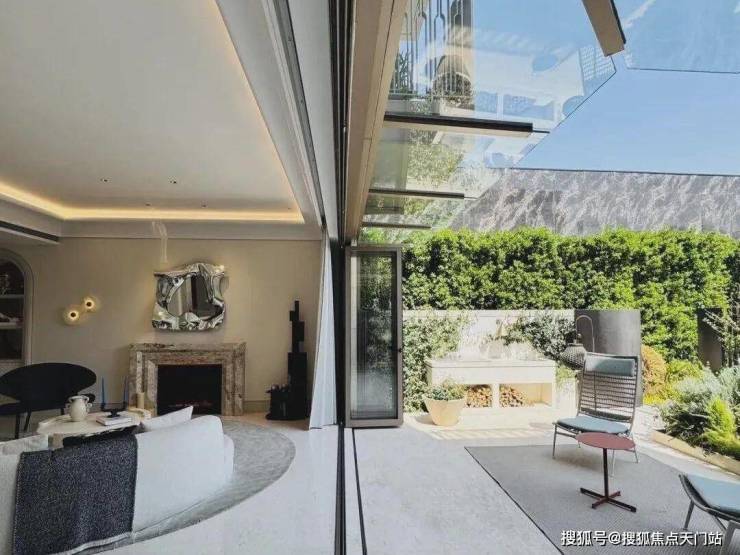 「无界空间」:客厅270度转角无柱设计,搭配落地玻璃,开阔视野将院中风景迎入日常。
