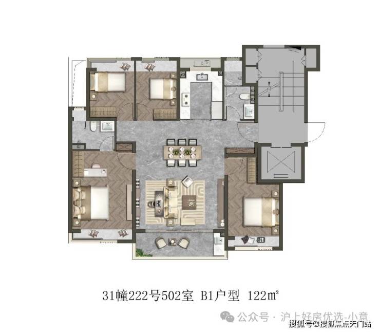 四房两厅两卫的布局,能做到两个房间朝南,主卧和南次卧的空间都很宽敞。