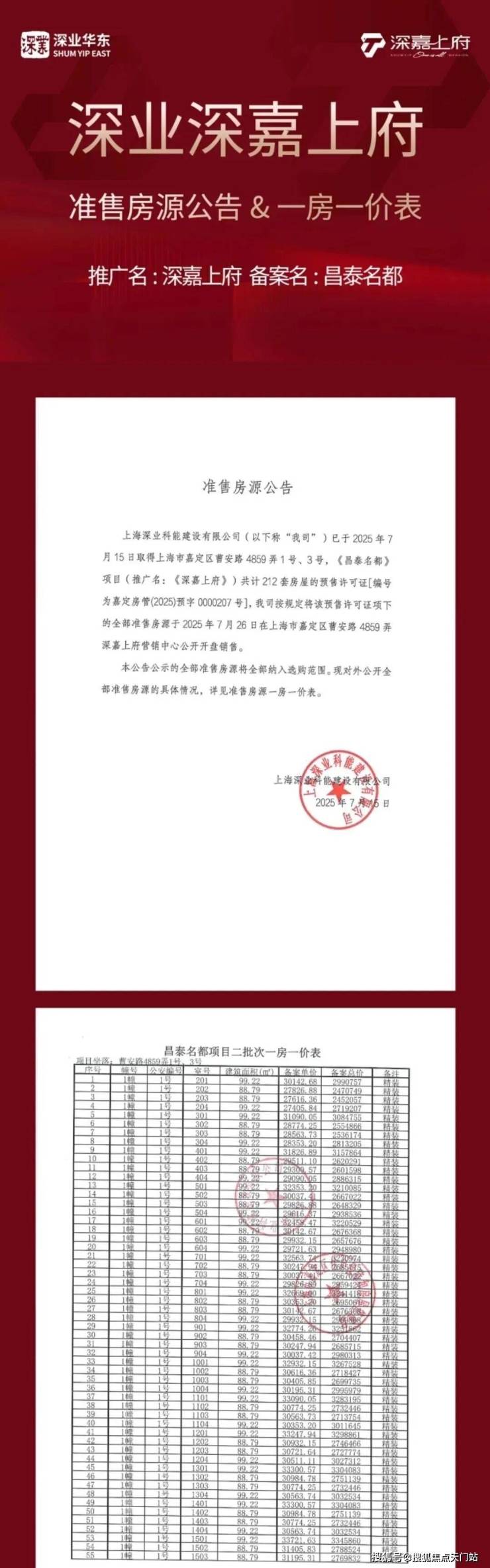 开发商:上海深业科能建设有限公司;推广名:深嘉上府、备案名:昌泰名都;预售许可证号:嘉定房管(2025)预字0000186号、嘉定房管(2025)预字0000207号;本宣传资料为要约邀请,针对本项目概况进行介绍,仅供参考不作为销售承诺。本项目不排除因政府相关规划、规定及开发商未能控制的原因而发生变化,最终以双方签署的正式《上海市商品房预售/销售合同》及其他相关协议文本为准。代理商:同策房产咨询集团股份有限公司、上海世联房地产顾问有限公司。发布日期:2025年07月,有效期3个月。广告/示意图