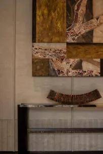 此外招商序更堪称一座手作慢艺的殿堂,许多珍贵的非遗绝技于此重获新生。从入户大堂巨幅火烧金箔艺术画作、秸秆镶嵌精妙入微的艺术装置、到源于西周的螺钿工艺的流光溢彩,每一个艺术品与画作都有着在地文化的故事,通常只能在内环豪宅中方可见到如此之多的手工艺术品。