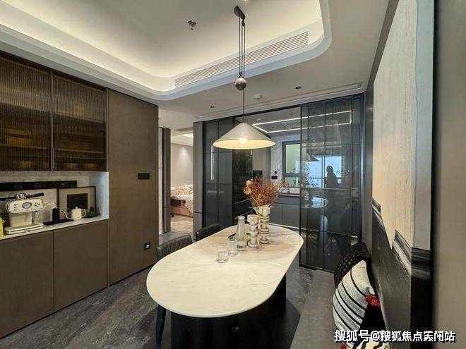 上海杨浦北京城建国誉府售楼处电话: 400-118-3159进门后左手边是一个 800库,连衣冠镜都有,内部可以按自己需求做隔断,行李箱、球拍、鞋子以及各种杂物尽可往里放.这在百平以内的小户型中并不常见,大多因为空间有限,通常都只打个玄关柜.餐客厅是这个户型的一大亮点,餐厅空间目前放的是4-6人长桌,小编现场估摸着放个一米左右的圆桌是可行的.这个餐边柜的开放格采用了鱼肚灰石材装饰也是交付标准之一.厨房部分巧妙的利用了飘窗台做水槽的设计,提升了厨房实际使用空间,实际上很多120㎡户型的厨房空间和国誉府这个98㎡的相比也就差不多大.