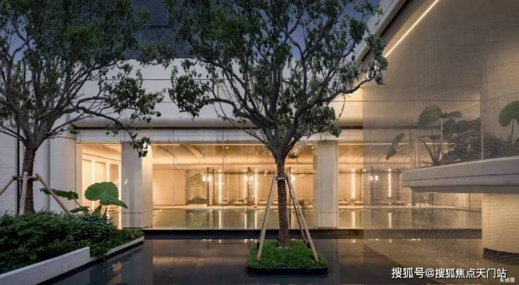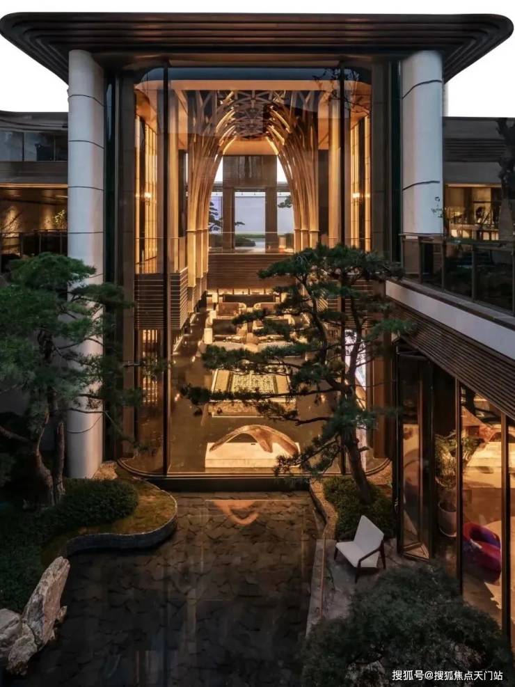 不同于寻常项目,招商序打造了约4.5m高的迎宾楼,玄关左右两侧均可通行,且各建有一处会客区域。还精选朴树、油橄榄等名贵树种植入门头两侧,呈现出对称美学。