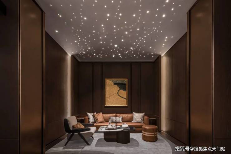 车辆缓缓驶入地库,迎宾坡道消除传统思维中对“星空顶”的奢华执念,以极具亲切感的姿态,展开归家序幕。古铜色铝板拼接成圆弧阵列,形似海浪轻抚,经手工拼接,与关永权的泛光设计融为一体,回家的光线并非刺眼的亮光,更有归家的温馨感与层次。