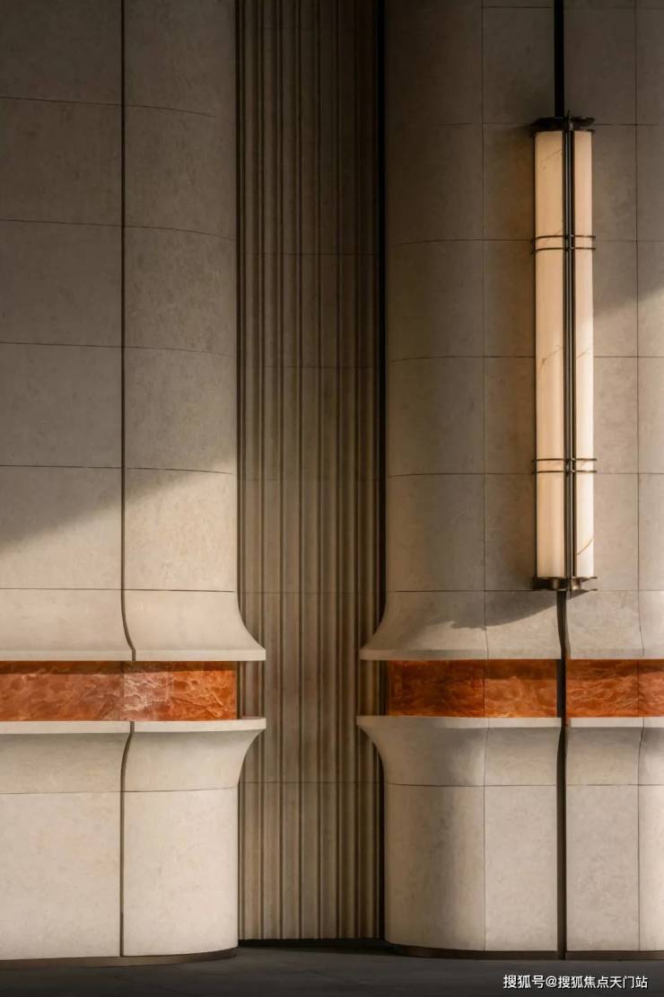 招商序藉由“吴淞灯塔”及其形制,原创落客雕塑“源流”,保加利亚进口的沉香米黄石材的底座,搭配以安哥拉黑大理石、云石玻璃,营造温润归家昭示。整个前庭形成艺术感与实用性兼具的环岛式落客区,进一步提升仪式感。