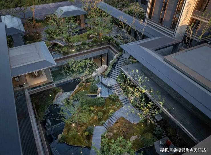 这点在项目的下沉式庭院里,感受尤为真切。借助下沉式庭院与一层地面的高差变化与围合空间的处理,打造一处 垂直的立体花园,每一步都有新的视觉体验。