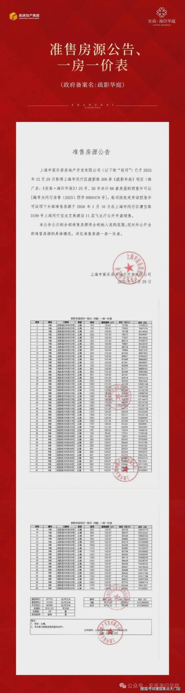 最新消息:莘庄副中心“十年一遇”纯新改善盘——【安高·海印华庭】已取证,12月31日开启认购!首批次主推建面约120㎡3房,过会均价82590元/㎡!一房一价已出炉: