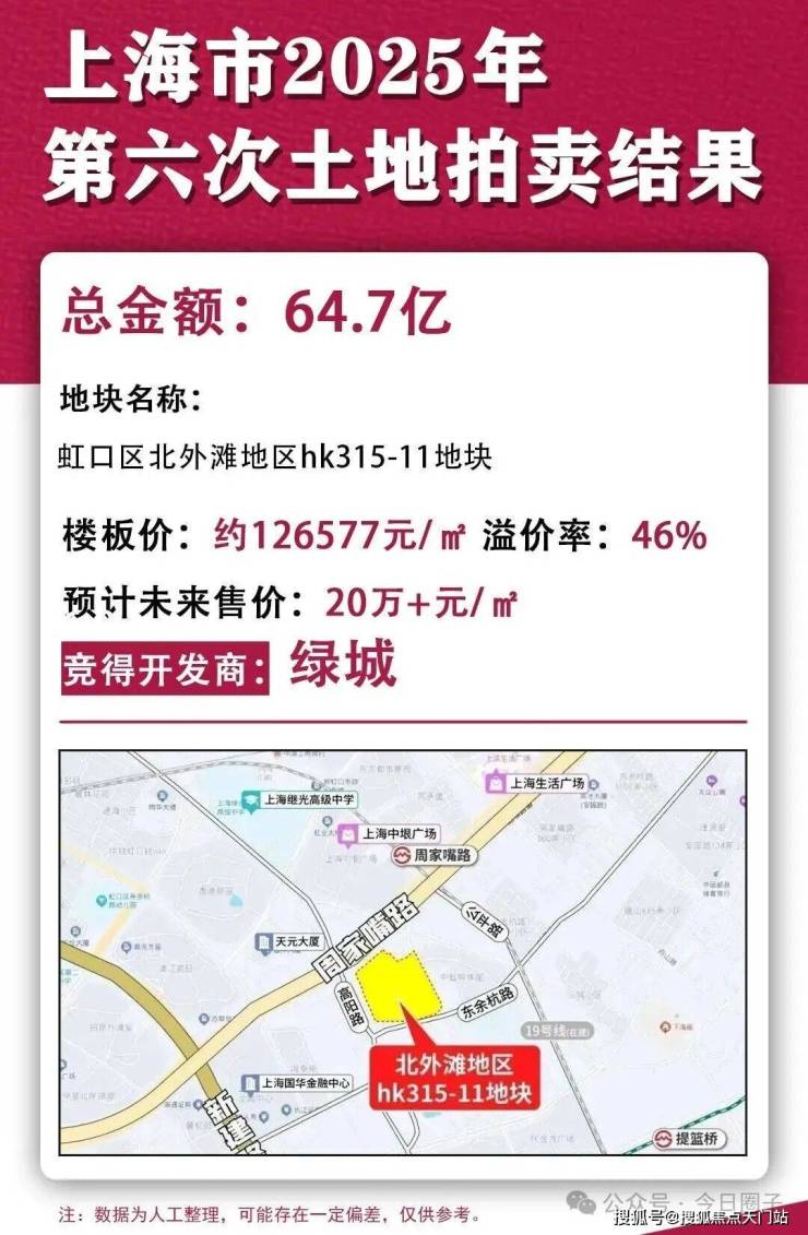 回溯至7月25日,在上海第六批次住宅用地集中出让活动中,绿城集团以64.7亿元人民币的总价成功竞得该地块,地块溢价率高达46%,折合楼面价约为12.66万/㎡。